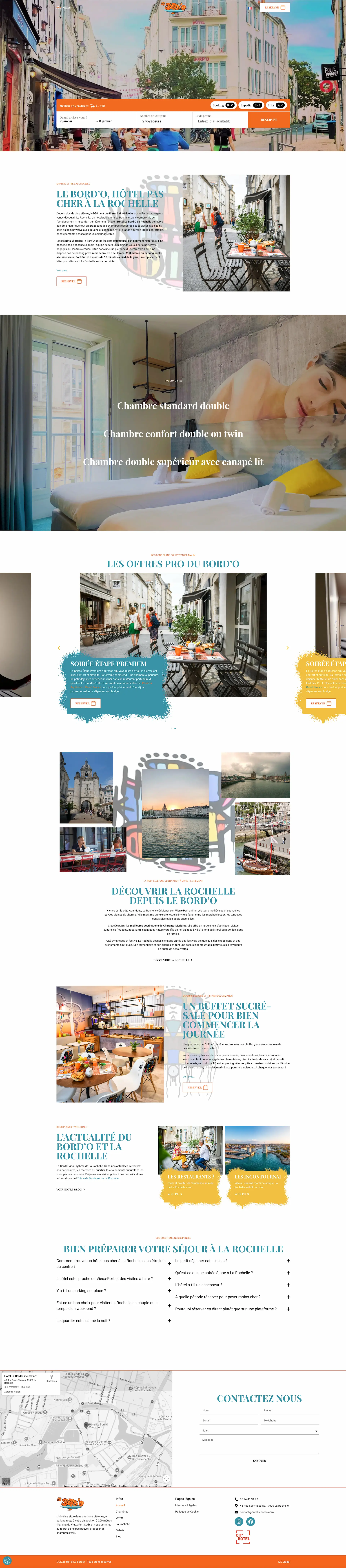 Afin de réaliser les demandes faites par Le Bord’O, nous avons travaillé sur un design sur-mesure qui reprenait l’aspect atypique de l’hôtel avec toutes ces couleurs vives. Nous nous sommes aussi occupés de mettre en place du référencement naturel en nous basant sur les mots qui comptent pour un hôtel, surtout sur un marché aussi compétitif que La Rochelle.